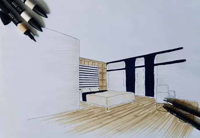 Réalisation d'une mise en perspective : intégrer une tête de lit sur mesure dans un recoin de chambre, afin d'optimiser les surface de rangement